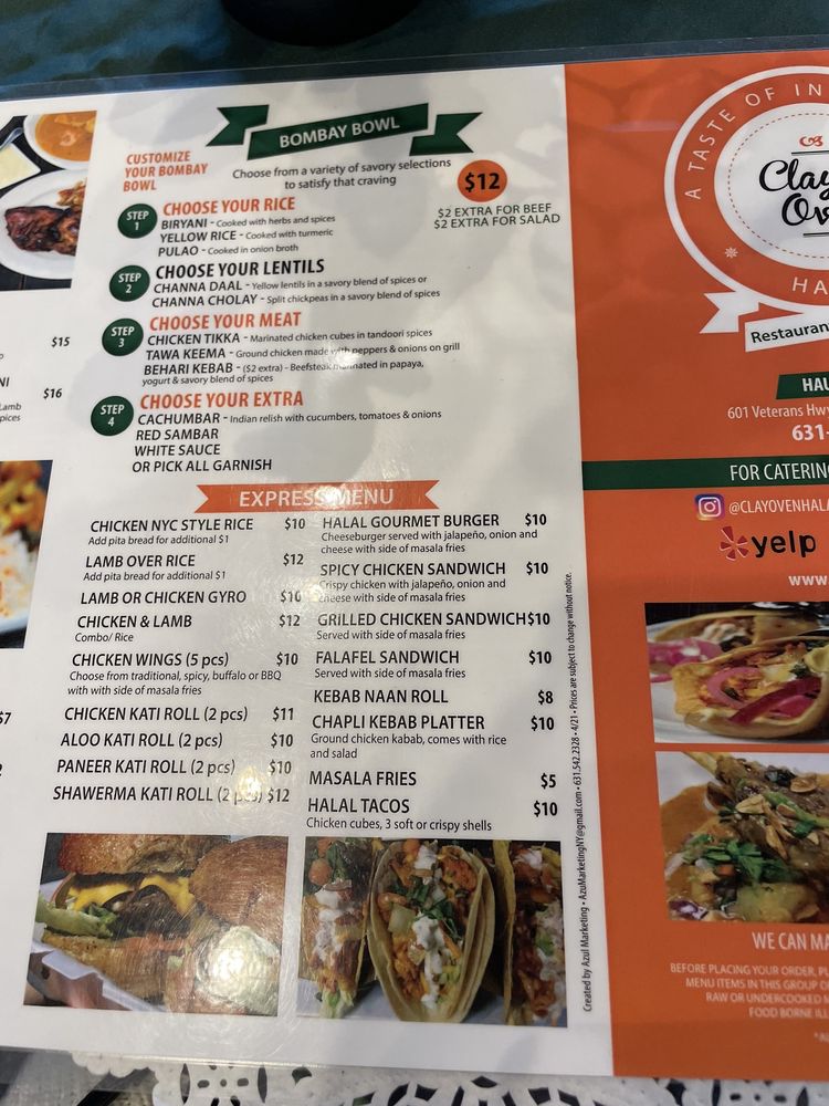 Introducing The Clay Oven, a Pakistani-Indian restaurant in Hauppauge, NY. This establishment offers a diverse menu with options for vegans and vegetarians. The appetizers include savory dishes like Vegetable and Chicken Samosas, Pakoras, and Lollipop Kathi. BBQ specials feature Tandoori Wings, Lamb Chops, and Boneless Chicken Tikka. Signature entres like Chicken Tikka Masala and Aloo Gosht showcase the flavors of Indian cuisine. Customers praise the generous portion sizes and flavorful dishes. The ambiance is casual with outdoor seating, making it suitable for groups and families. The Clay Oven is a must-visit for those craving authentic Pakistani - Indian flavors in a welcoming environment.