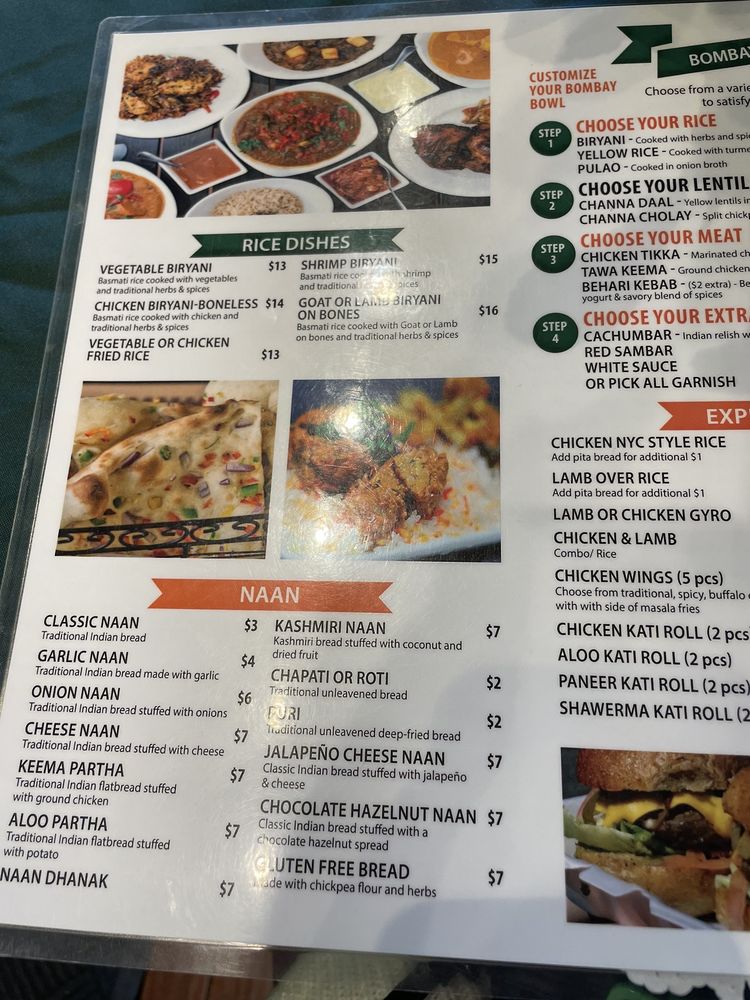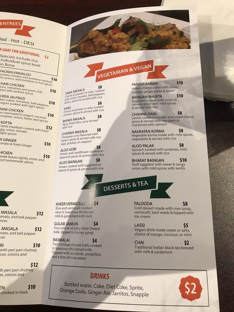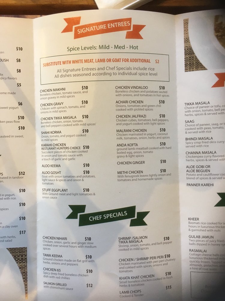 Chicken marinated in yogurt, coconut, milk, tomatoes, onion, herbs, and spices. Signature entres include rice. Dishes seasoned according to individual spice level. Lamb and goat meat on bone.