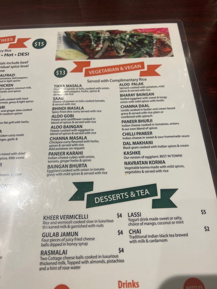 With fenugreek leaves lightly onion, tomatoes, and homemade spices. Signature entres include rice. Dishes seasoned according to individual spice level. Lamb and goat meat on bone.