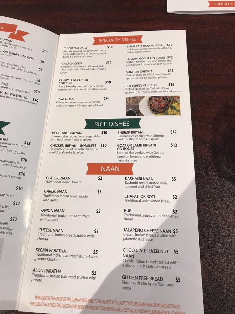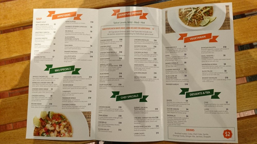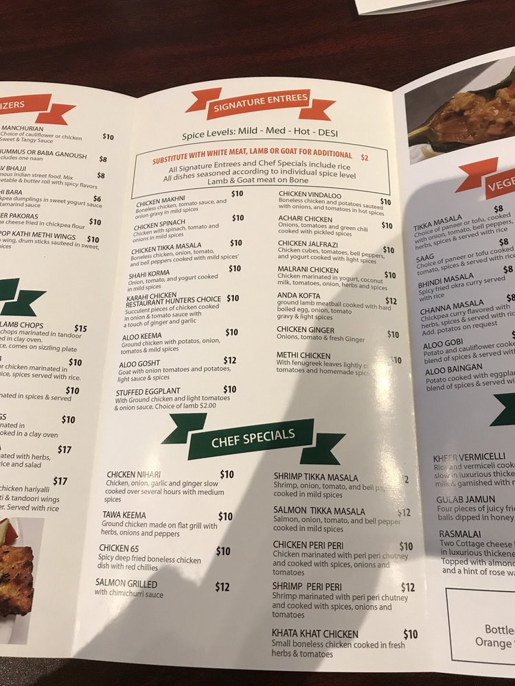 Lamb and goat meat on bone. Boneless chicken, tomato sauce, and onion gravy in mild spices. Signature entres include rice. Dishes seasoned according to individual spice level. Lamb and goat meat on bone.